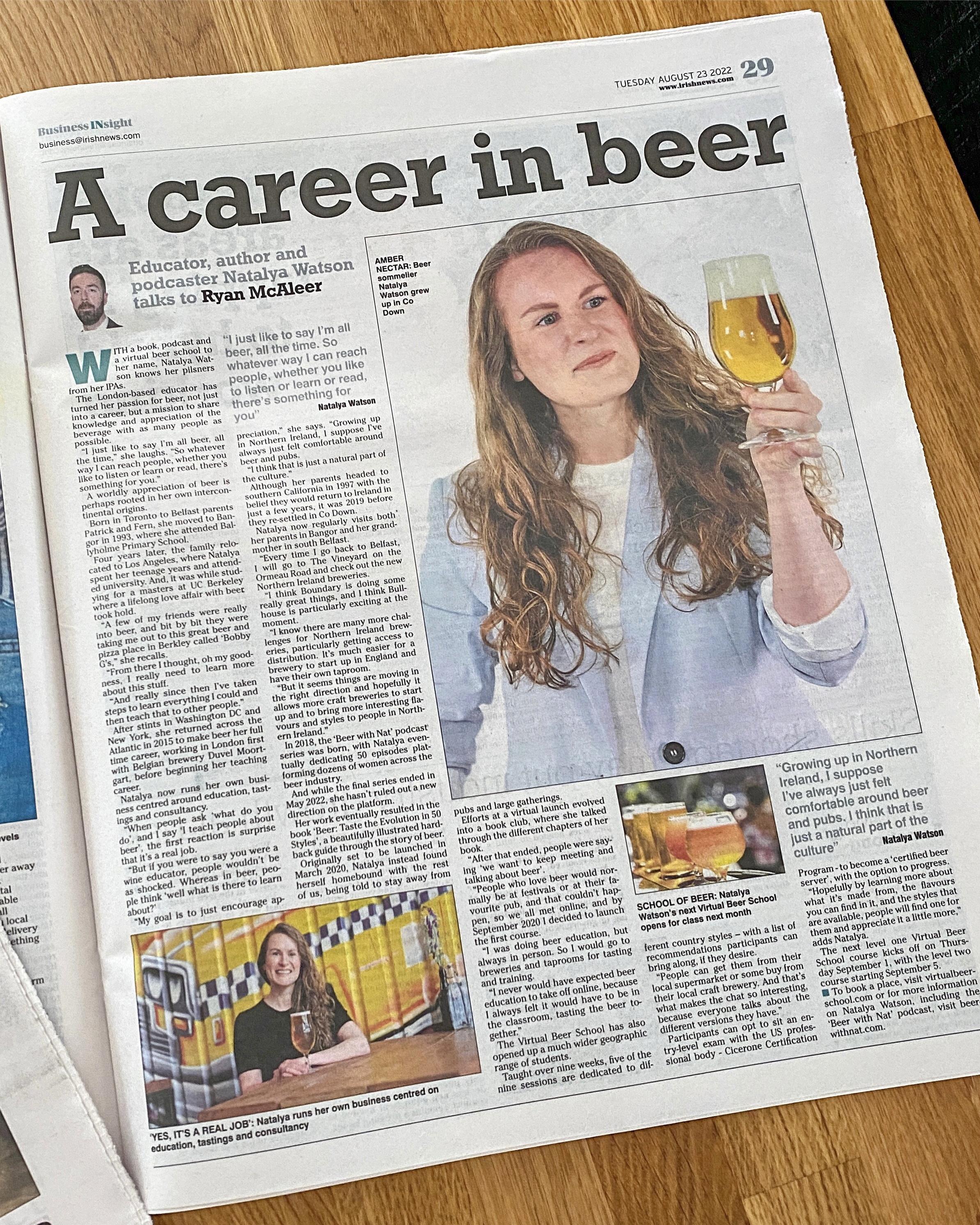 - The Irish News, ‘Sommelier likes the hops: Bangor-raised author, educator and podcaster Natalya Watson on a career in beer’ (August 2022)